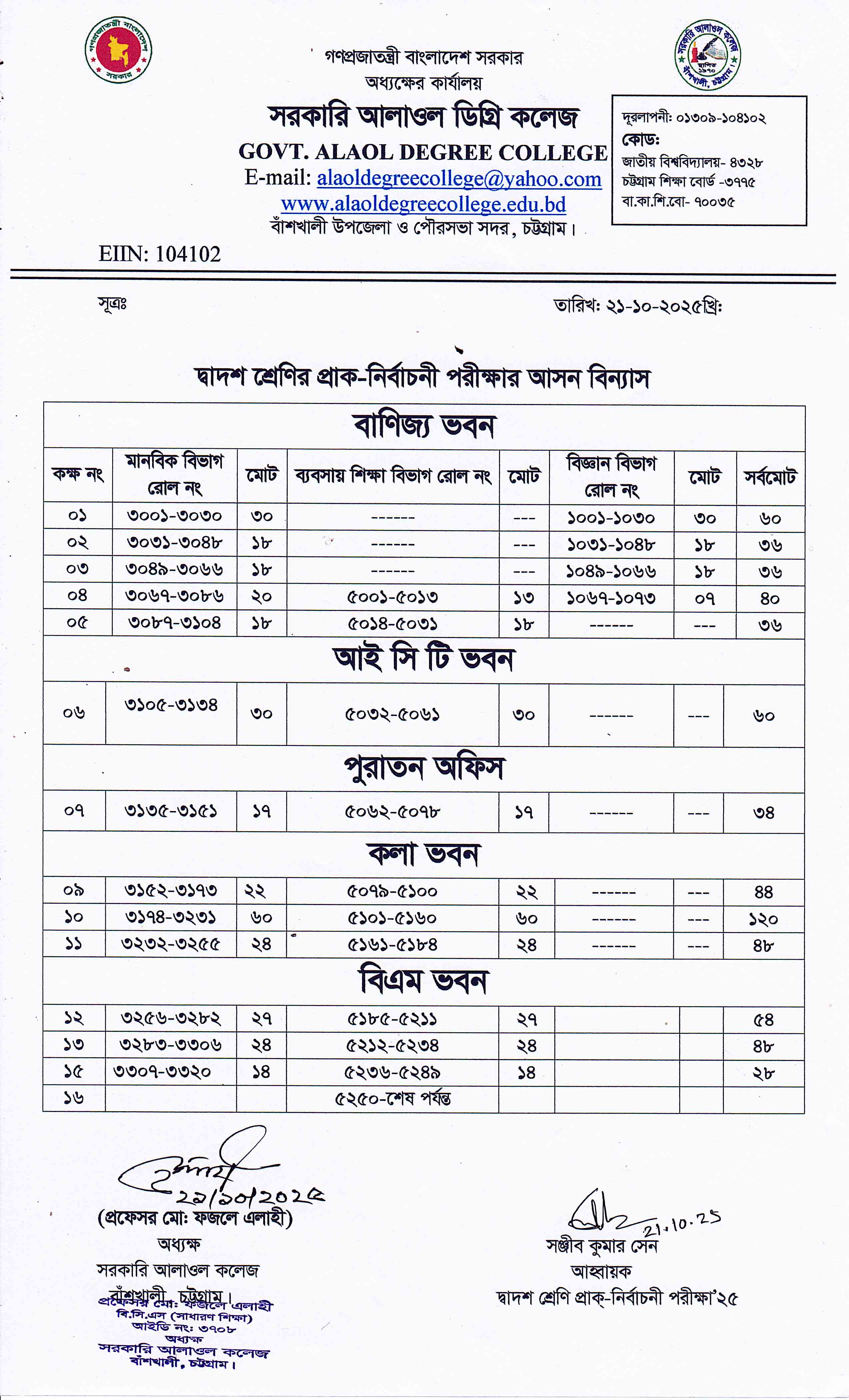 College Code : 4328 Jaldi, Banskhali, Chittagong; 01309104102