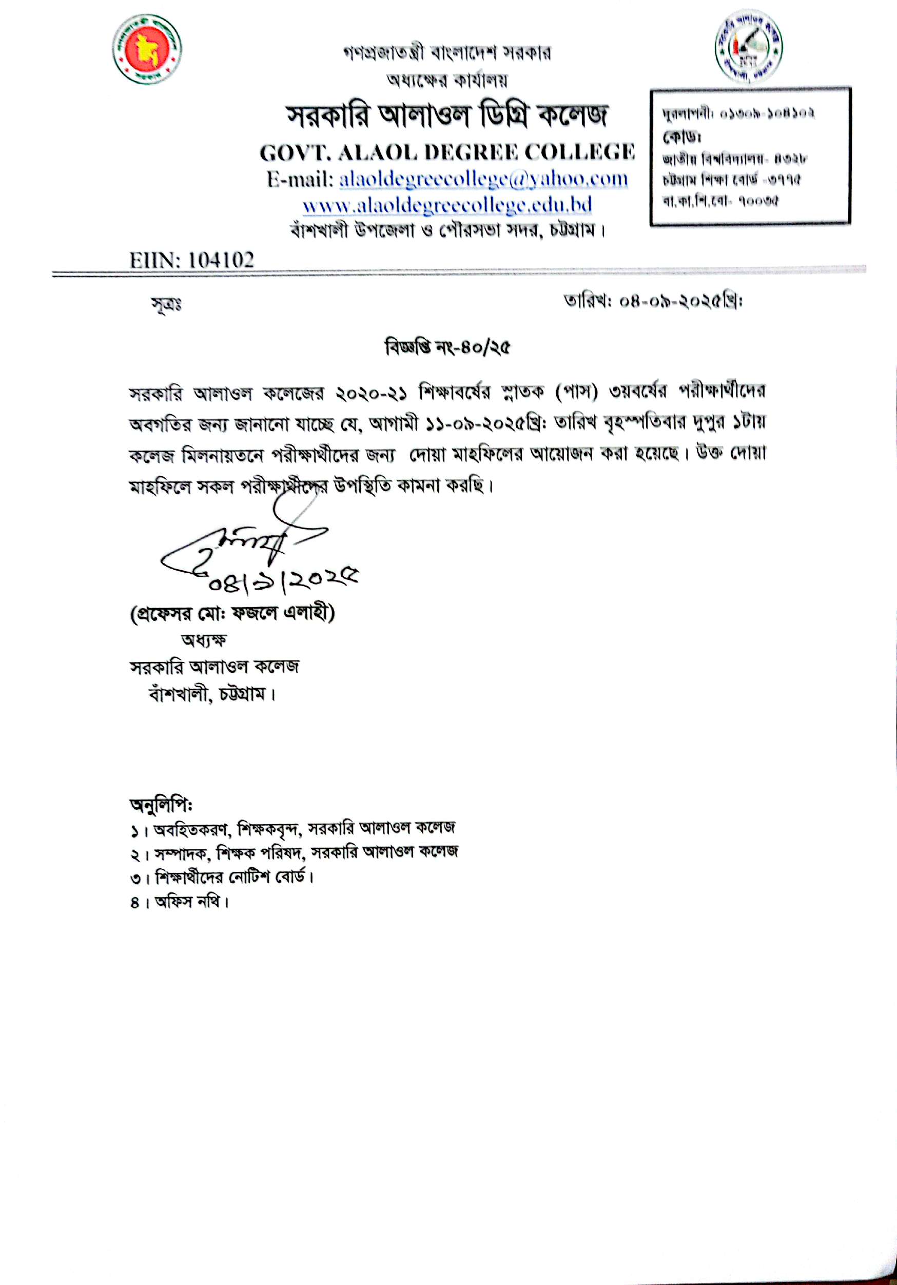 09/04/2025 স্নাতক (পাস) ৩য়বর্ষ পরীক্ষার্থীদের দোয়া মাহফিল সংক্রান্ত বিজ্ঞপ্তি।