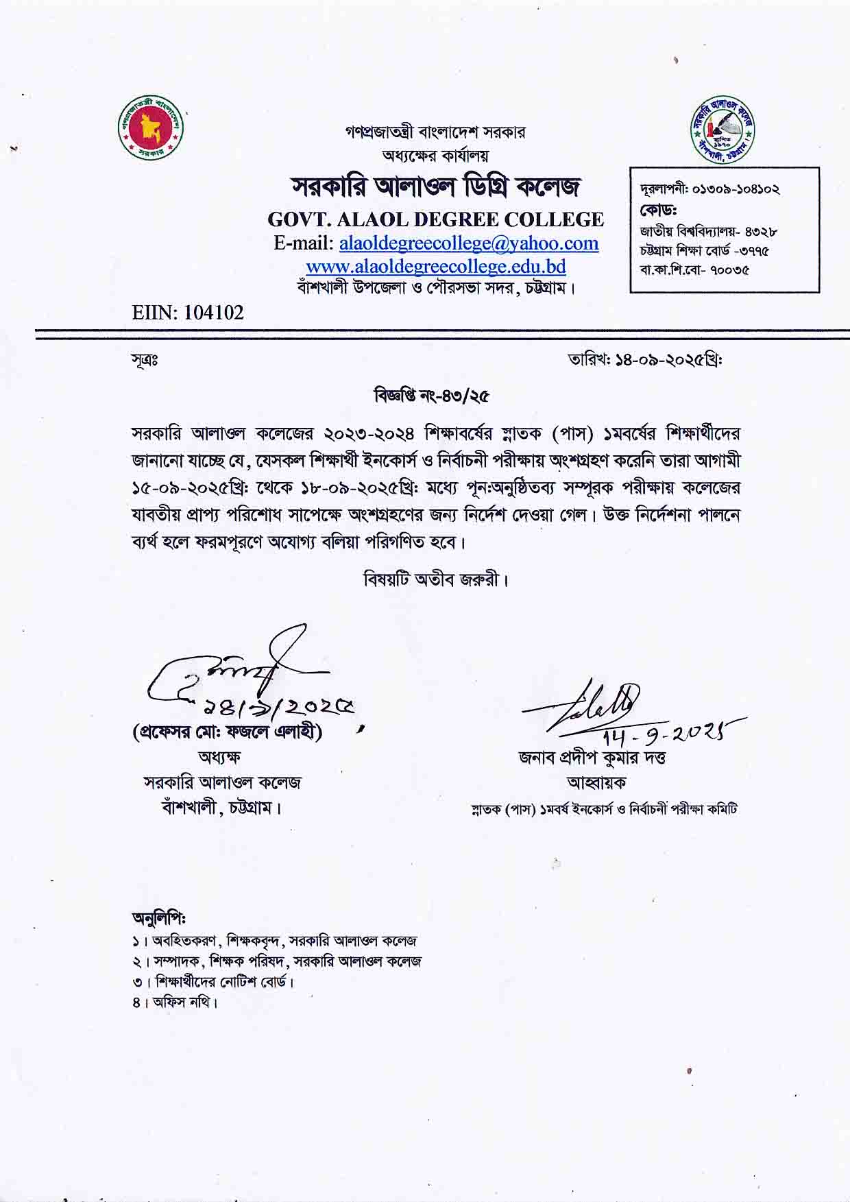 09/14/2025 ২০২৩-২০২৪ শিক্ষাবর্ষের স্নাতক (পাস) ১মবর্ষের পূন: ইনকোর্স ও নির্বাচনী পরীক্ষা সংক্রান্ত বিজ্ঞপ্তি।