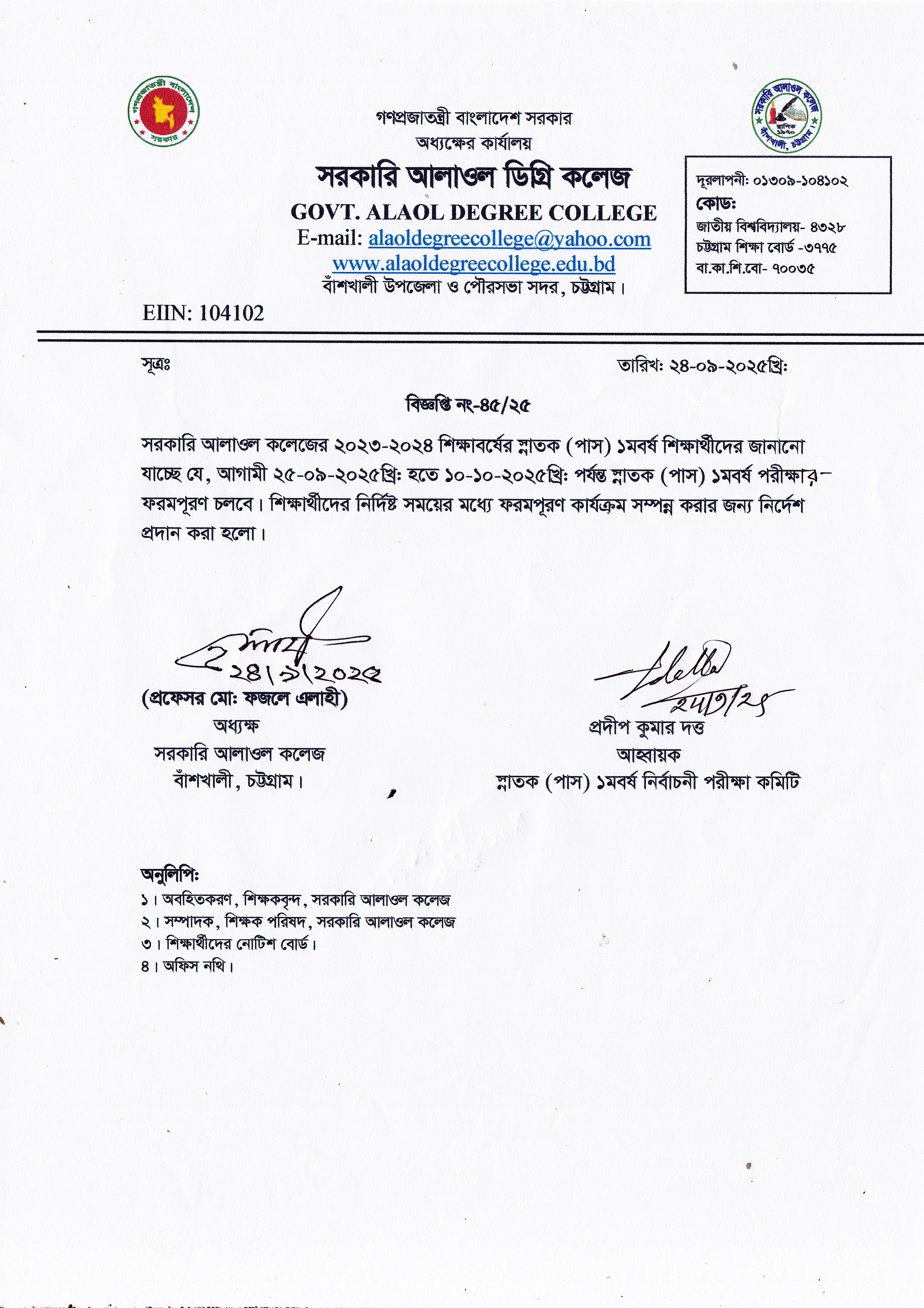 09/24/2025 ২০২৩-২০২৪ শিক্ষাবর্ষের স্নাতক (পাস) ১মবর্ষের ফরমপূরণ সংক্রান্ত বিজ্ঞপ্তি।