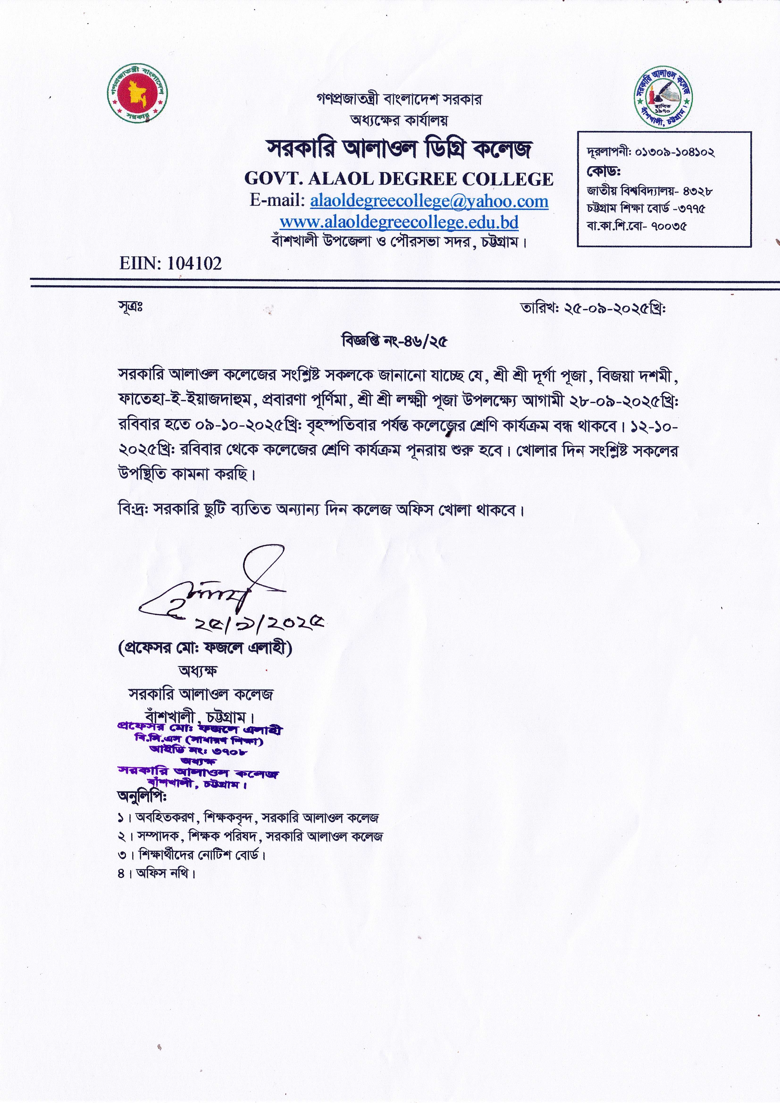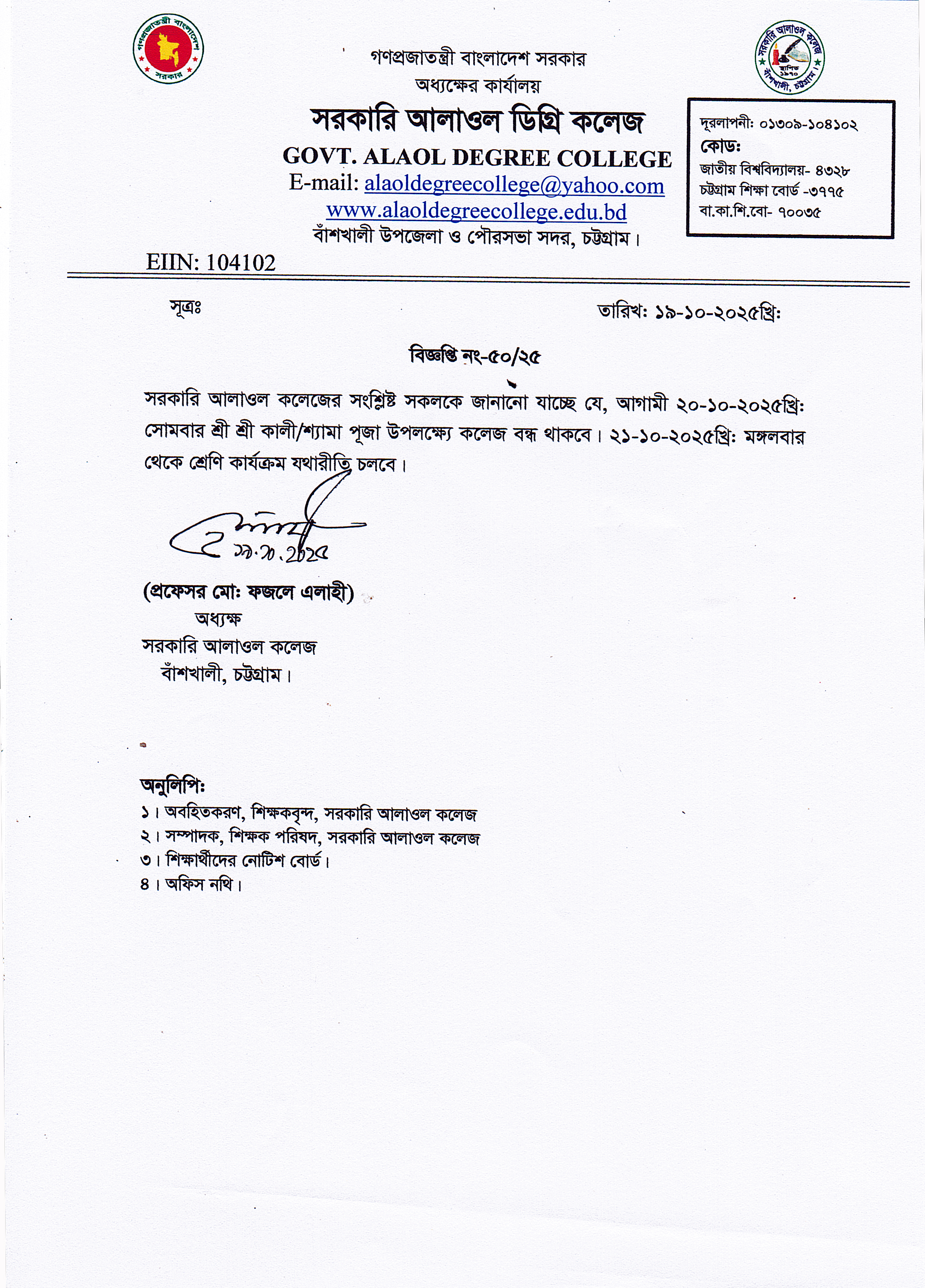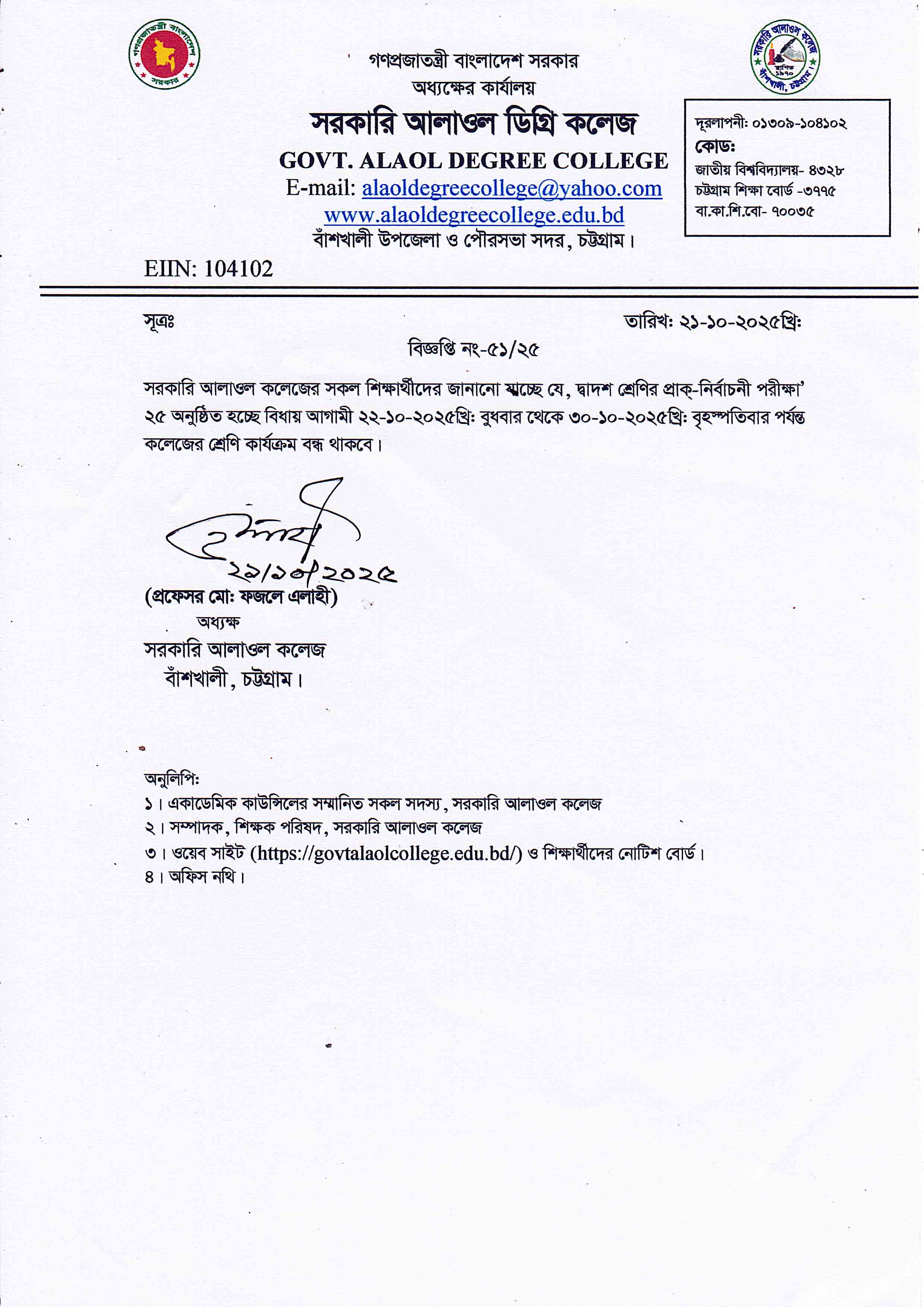 10/21/2025 কলেজের শ্রেণি কার্যক্রম বন্ধ সংক্রান্ত বিজ্ঞপ্তি।