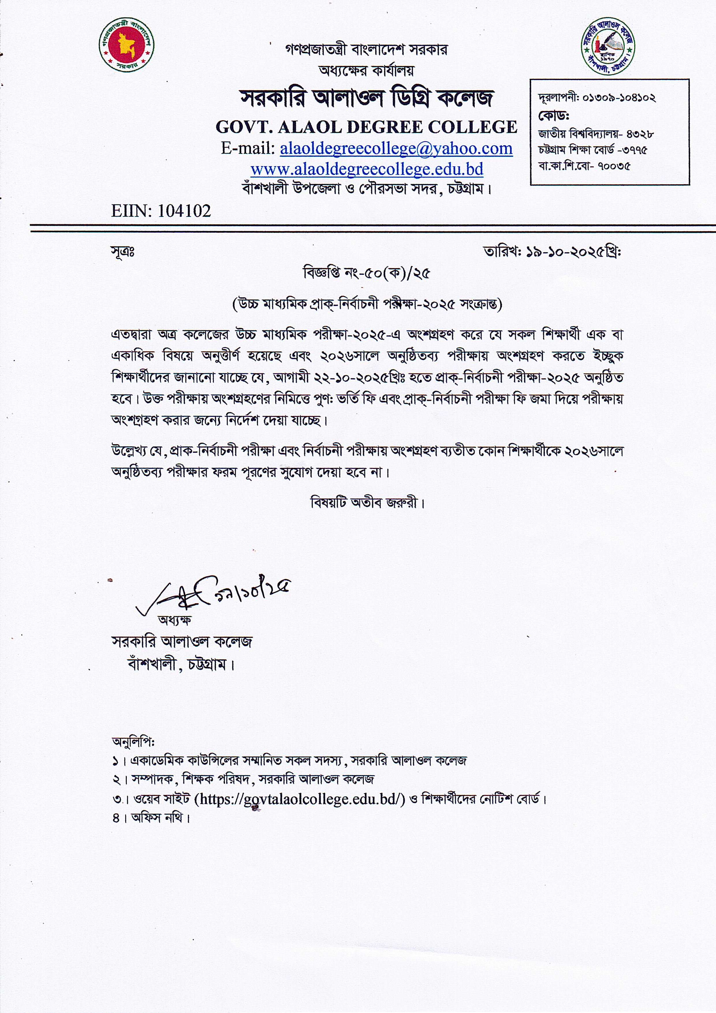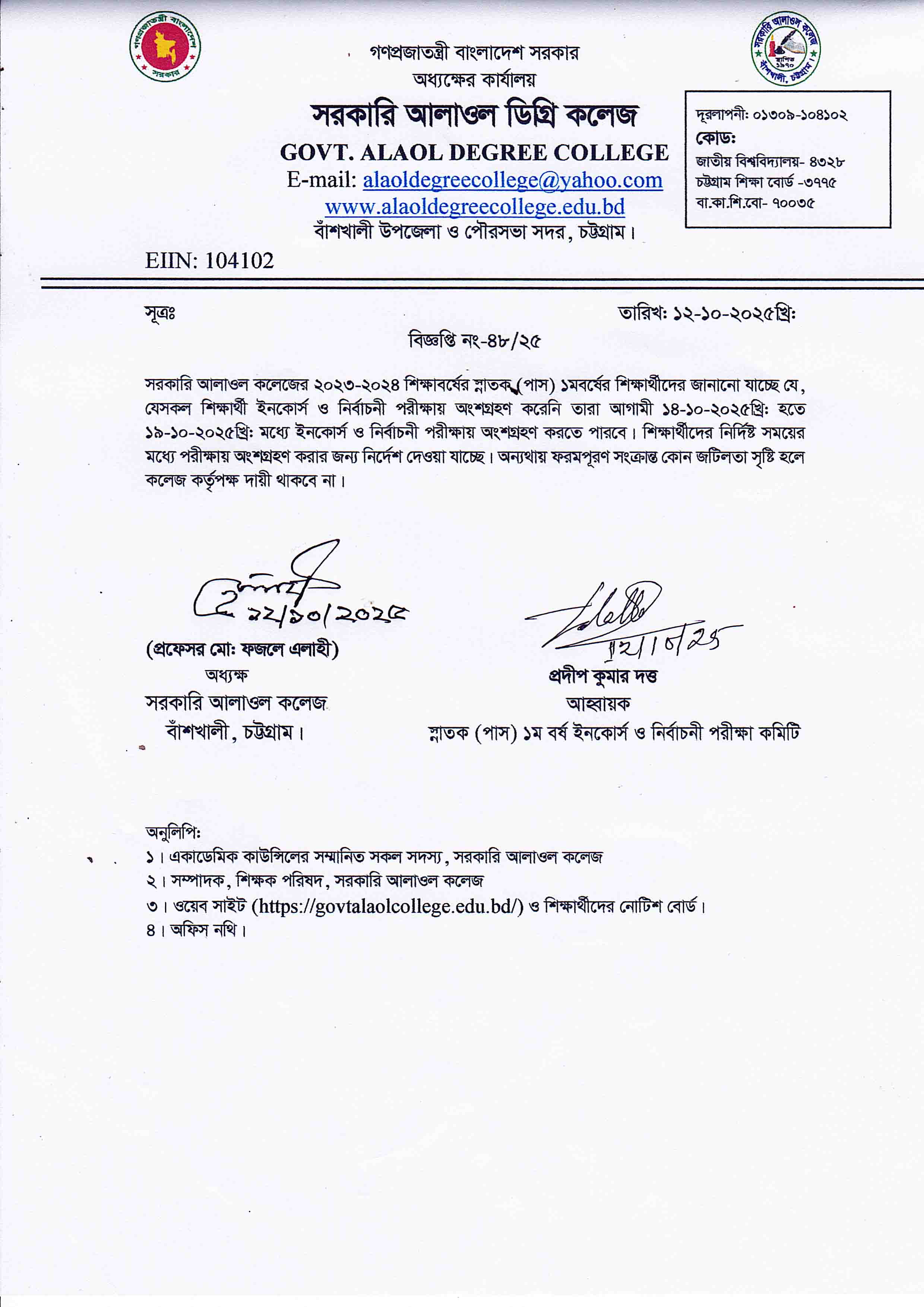 10/12/2025 ২০২৩-২০২৪ শিক্ষাবর্ষের স্নাতক (পাস) ১মবর্ষের পূন: ইনকোর্স ও নির্বাচনী পরীক্ষা সংক্রান্ত বিজ্ঞপ্তি।