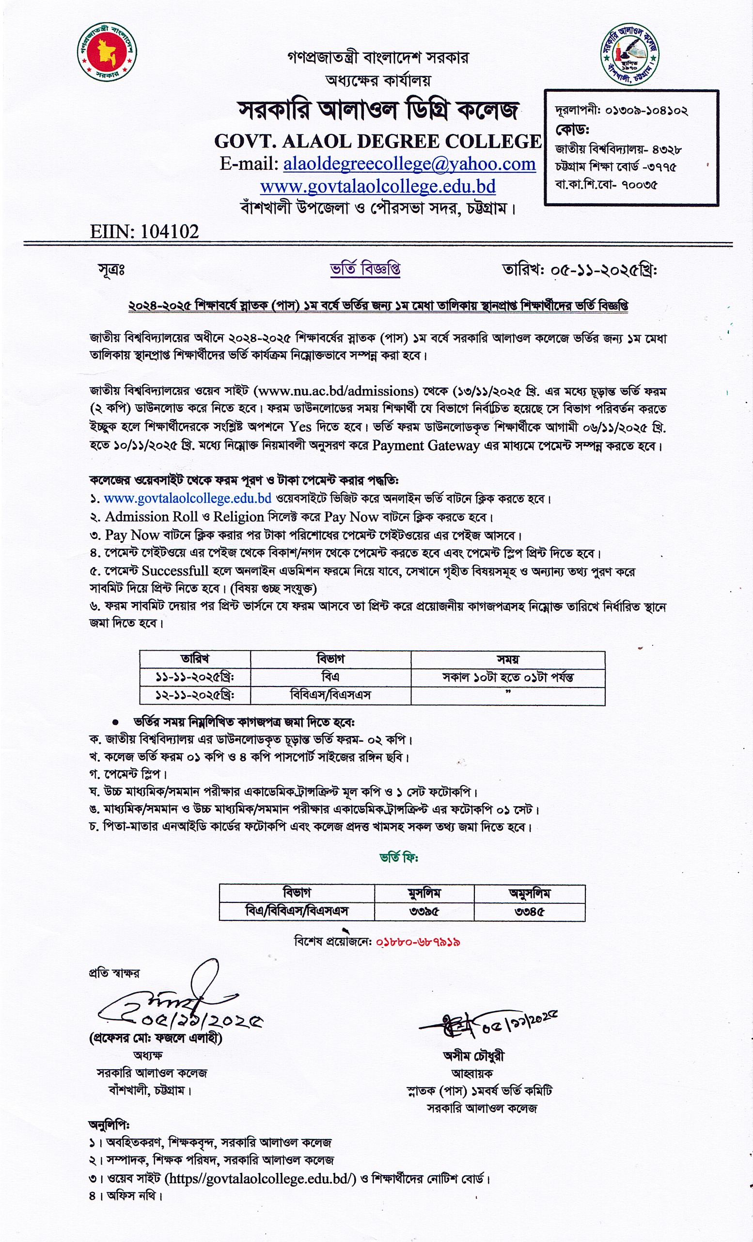২০২৪-২০২৫ শিক্ষাবর্ষের স্নাতক (পাস) ১মবর্ষের ভর্তি সংক্রান্ত বিজ্ঞপ্তি।