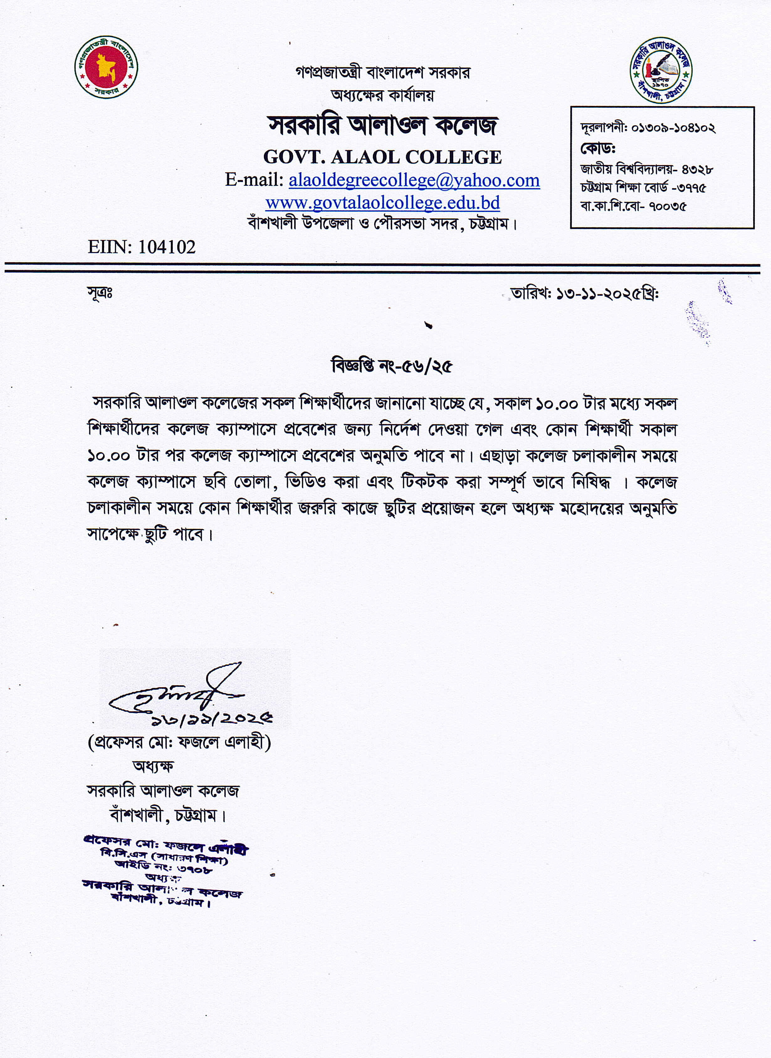 College Code : 4328 Jaldi, Banskhali, Chittagong; 01309104102